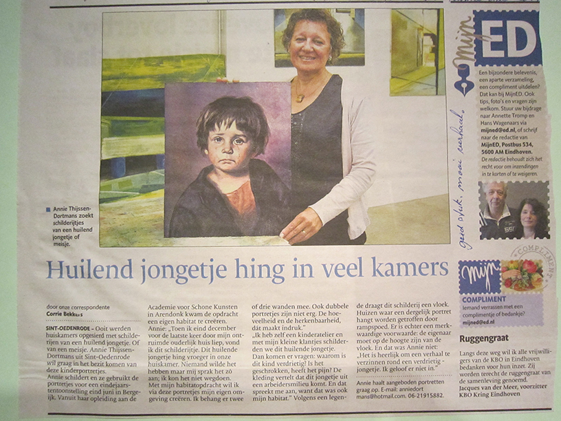 Om een verzameling Huilende Kinderen bij elkaar te krijgen heb ik toen een oproep gedaan via het Eindhovens Dagblad. Hierop kreeg ik al snel van de redactie wat ik wilde met die reproducties? Waren deze bestemd voor de verkoop? Toen men hoorde dat ik die Huilende Kinderen wilde gebruiken voor mijn eindejaarstentoonstelling van Arendonk, vroeg men mij om een interview. Er volgde snel een prachtig verslag van dit gesprek. Hierop volgde een dertigtal reacties waarover ik afzonderlijke verslag maak in een aparte bijlage. We hebben een tocht van 500 km gemaakt dwars door Oost-Brabant, waarbij we vele reproducties hebben opgehaald. Ik maakte van elke bezoek een kort verslag. Ik maakte van elke eigenaar een foto met het aangeboden schilderij. Alle gulle gevers kregen van mij een herinneringsfoto van het Huilend Kind waarmee ik in de krant stond afgebeeld. Daarnaast gaf ik een uitnodiging voor de expositie in Bergeijk. Enige weken later nam het Eindhovens Dagblad het initiatief om een reportage te maken van mijn zoektocht naar het Huilend Kind. Dit werd wederom een mooi verslag.